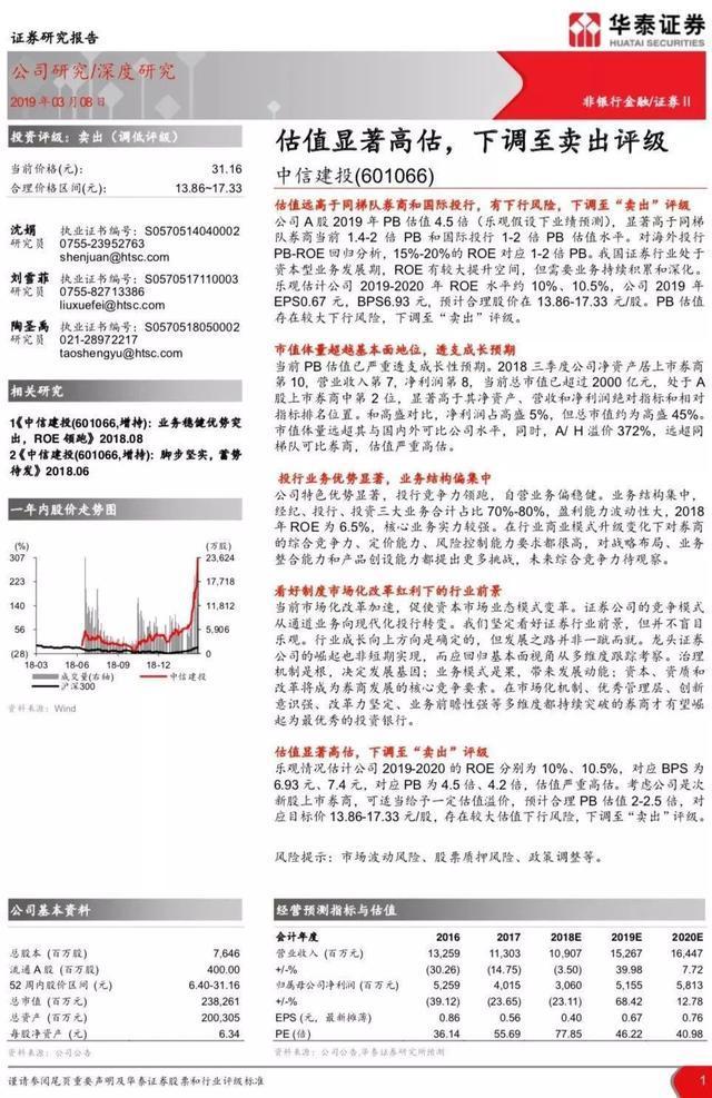 3月8日,华泰证券对中信建投出具“卖出”评级研报。华泰证券研报指出,中信建投估值远高于同梯队券商和国际投行,有下行风险,下调至“卖出”。报告认为,中信建投A股2019年PB估值4.5倍(乐观假设下业绩预测),显著高于同梯队券商当前1.4-2倍PB和国际投行1-2倍PB估值水平。PB估值存在较大下行风险,下调至“卖出”评级。